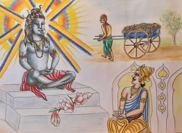 Krishna et Arjuna marchent sur la route. Tout d’un coup, ils voient un homme tirer une charrette chargée de fleurs