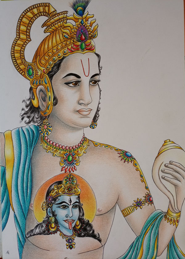 LA MÈRE : Quoi ? Est-ce vrai ? Je n’en crois pas mes oreilles. Cela signifie que ton père vénère Krishna à présent. Je suis si heureuse qu’enfin tu aies remplacé Kali par Krishna.