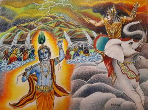 INDRA : Comment ose-t-il écouter ce petit garçon, ce chenapan de Krishna ! Je vais leur montrer ! Je vais leur donner une leçon ! Je vais inonder cet endroit !